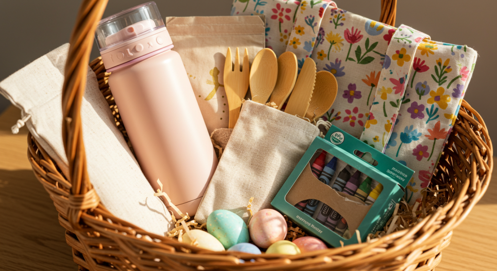 Include sustainable and reusable items like a beautiful stainless steel water bottle, a set of bamboo travel utensils, plant-based or beeswax crayons, and a stylish, foldable tote bag.