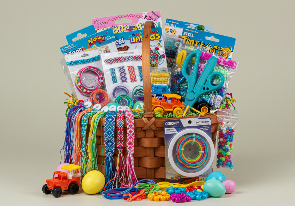Encourage hands-on creativity with a basket full of DIY project materials like friendship bracelet kits, model kits, or beading supplies. This will keep kids entertained for hours.