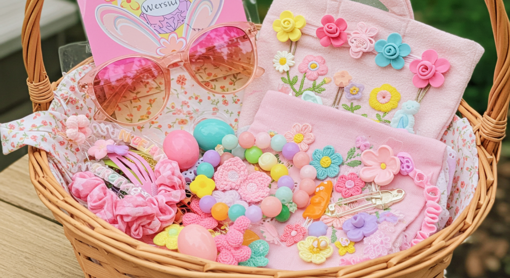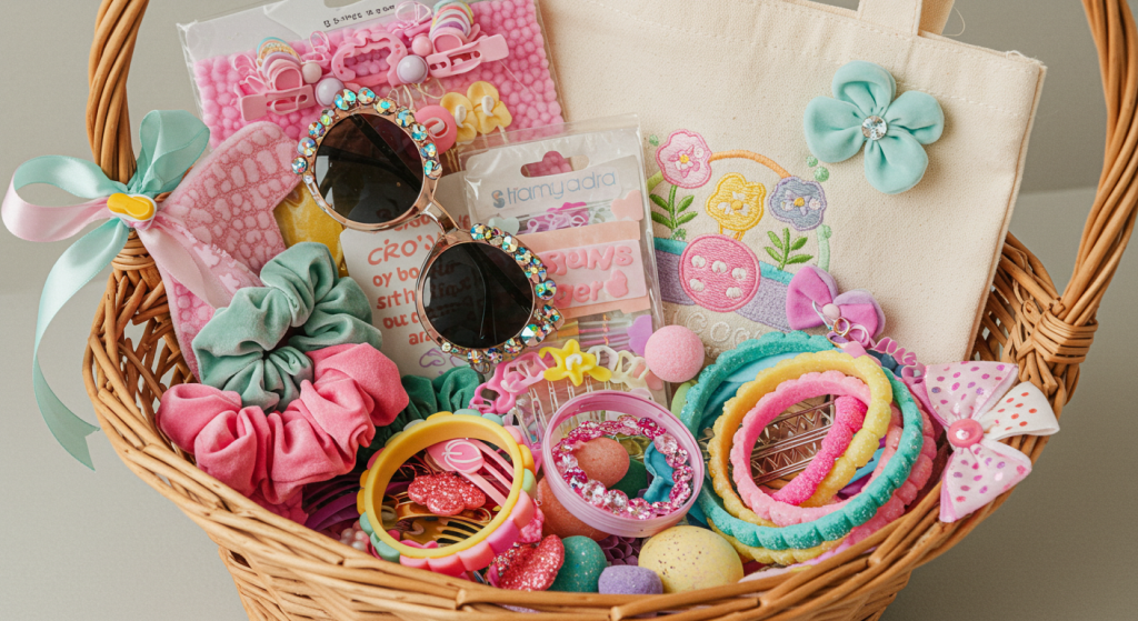 For teens and fashion-forward kids, consider a style-themed basket with trendy sunglasses, bracelets, hair accessories, and a cute tote bag.