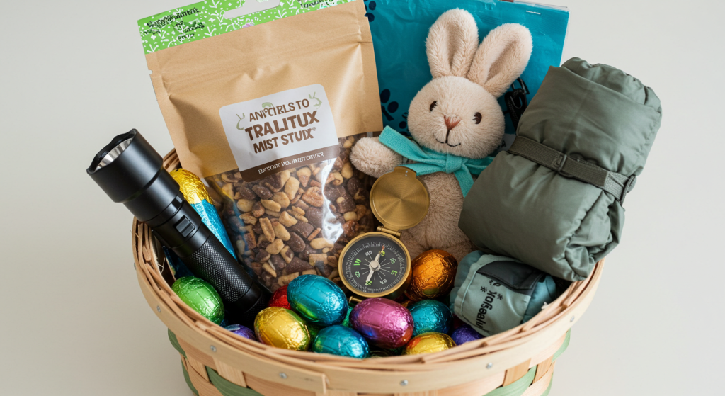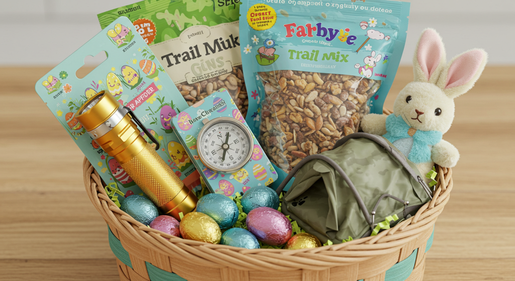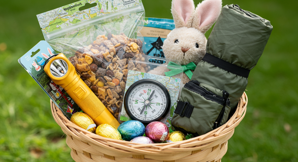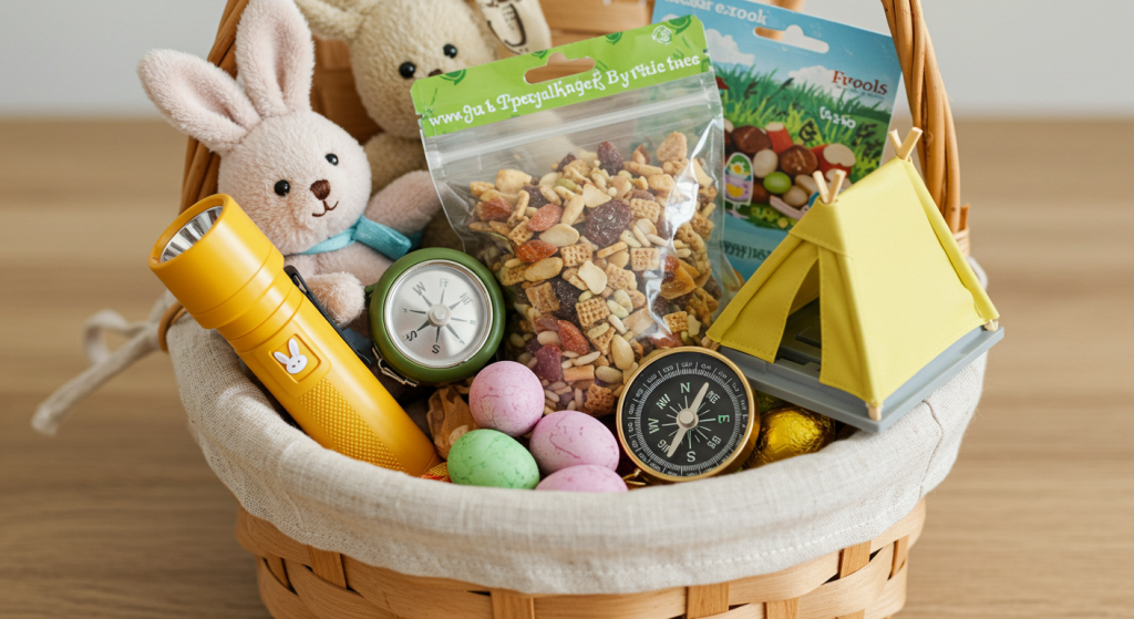For outdoor enthusiasts, put together a camping basket with essentials like a flashlight, compass, trail mix, and a small tent or sleeping bag. This is ideal for kids who love nature and adventure.