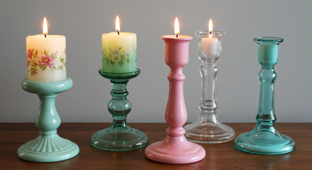 - For a soft, dreamy aesthetic, use vintage milk glass holders with pale pink or baby blue taper candles.