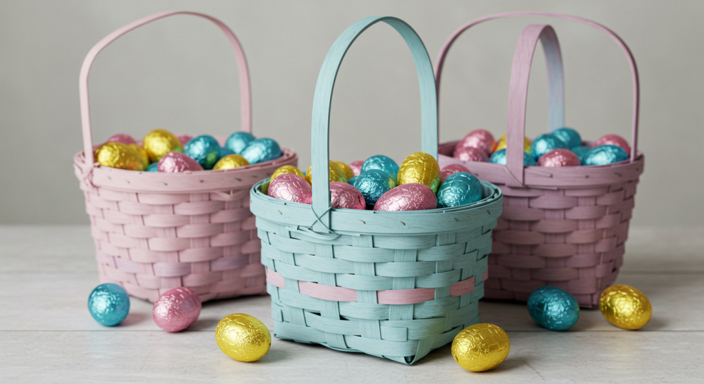 You can often find them in soft, pastel colors, such as pale pink, baby blue, or minty green. You can fill them with traditional chocolate eggs or use them as a base for a stunning floral arrangement.