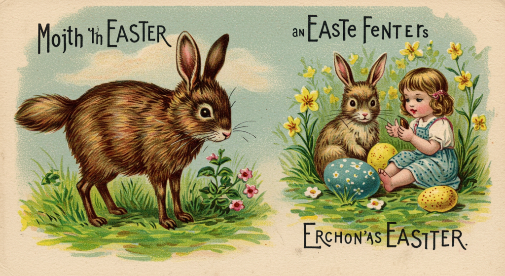 These colorful, often embossed cards feature cheerful messages and beautiful, sentimental illustrations. Common motifs include springtime flowers, anthropomorphic bunnies in human clothing, and religious symbols.