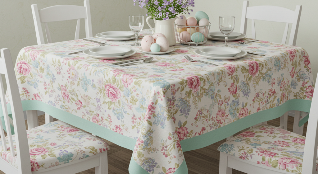 Choose a cloth with delicate blooms in classic pastel shades like lavender, mint green, or blush pink for a perfect Easter table setting. Look for details like embroidered flowers or delicate crochet lace edges.