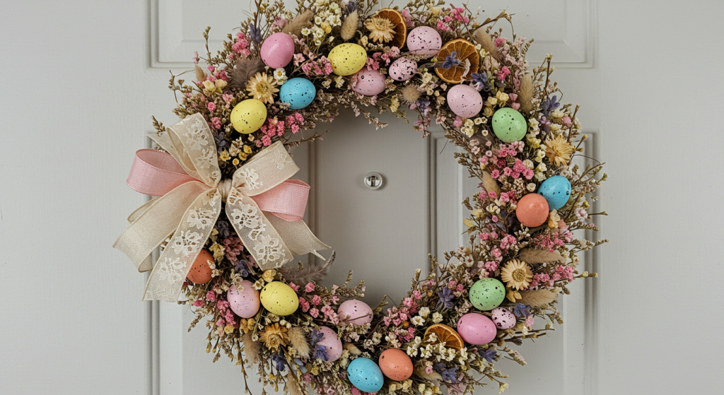 Look for wreaths made of natural materials like dried flowers, twisted grapevine, or soft pussy willow branches. Pastel ribbons and small, faux eggs are classic embellishments.