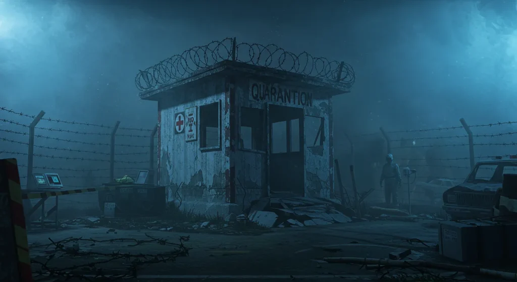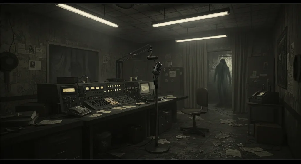 A dark room where the only sensory input is a looping, desperate radio broadcast. It tells the story of the collapse without showing anything.