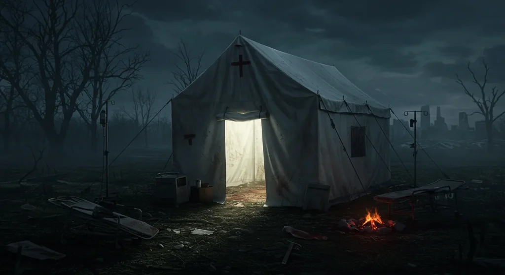 This scene shows the desperation of the early days. It is a ransacked, chaotic space that feels like it was abandoned in a hurry.
