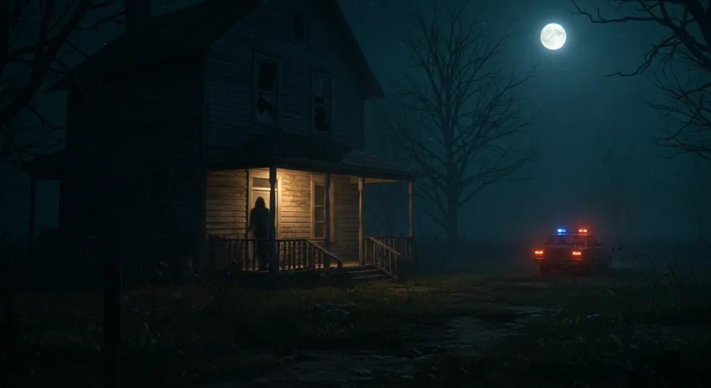 - The actor should be partially hidden in the shadows, perhaps at the edge of the woods or down the street.