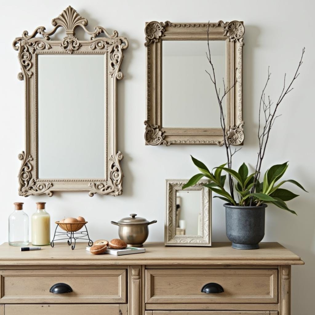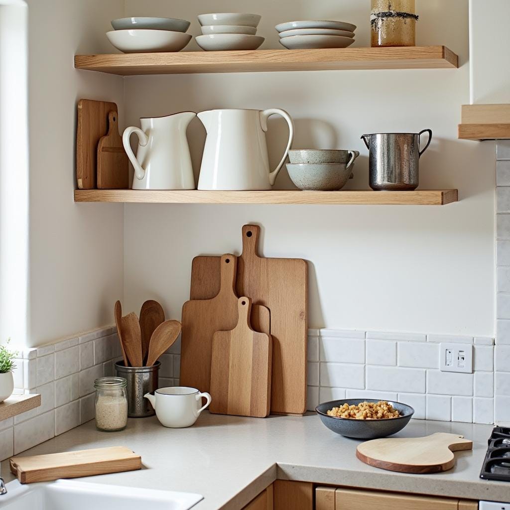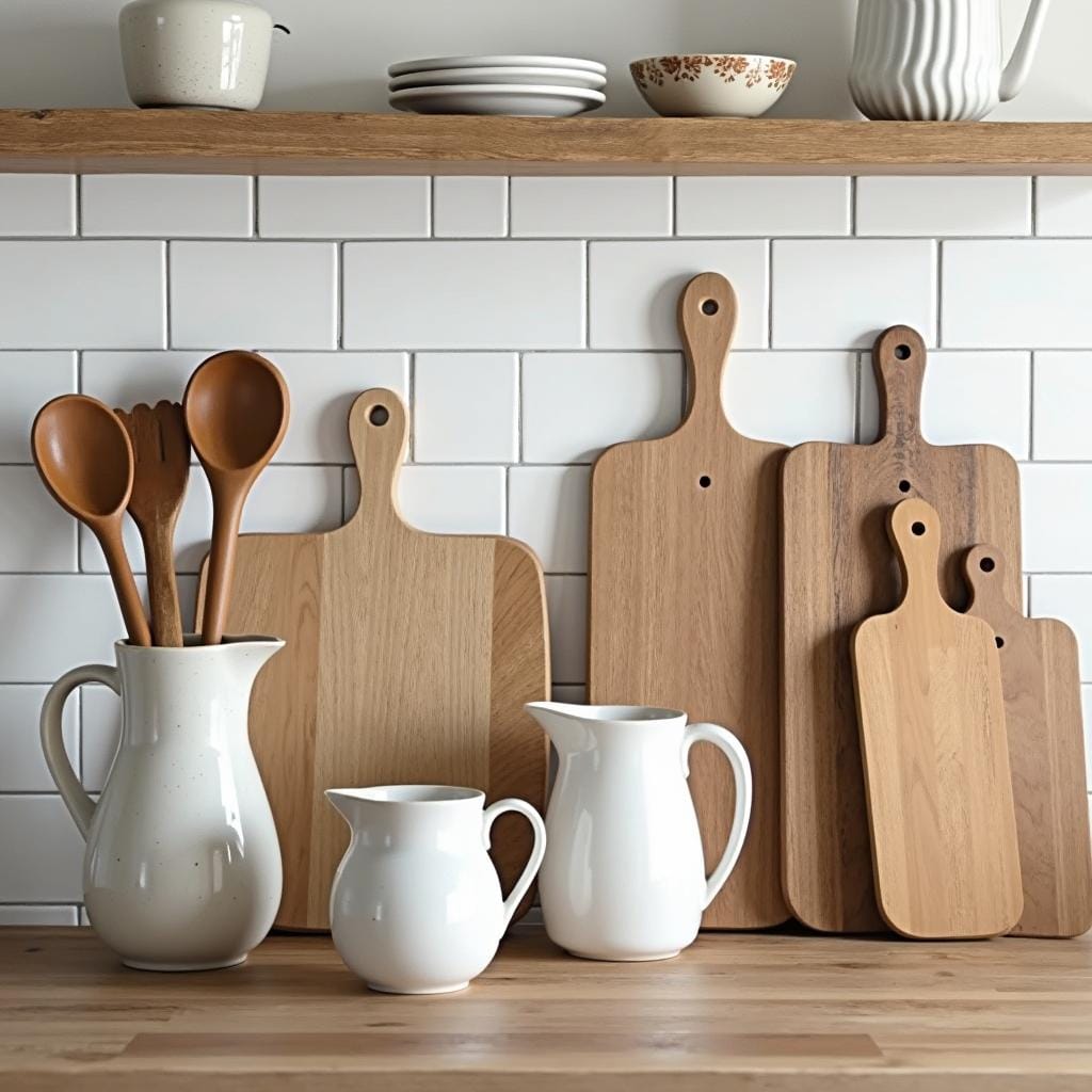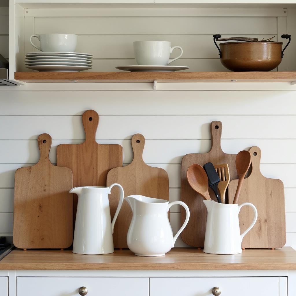 Add wooden cutting boards, ceramic pitchers, and vintage utensils to your kitchen for a touch of farmhouse charm.