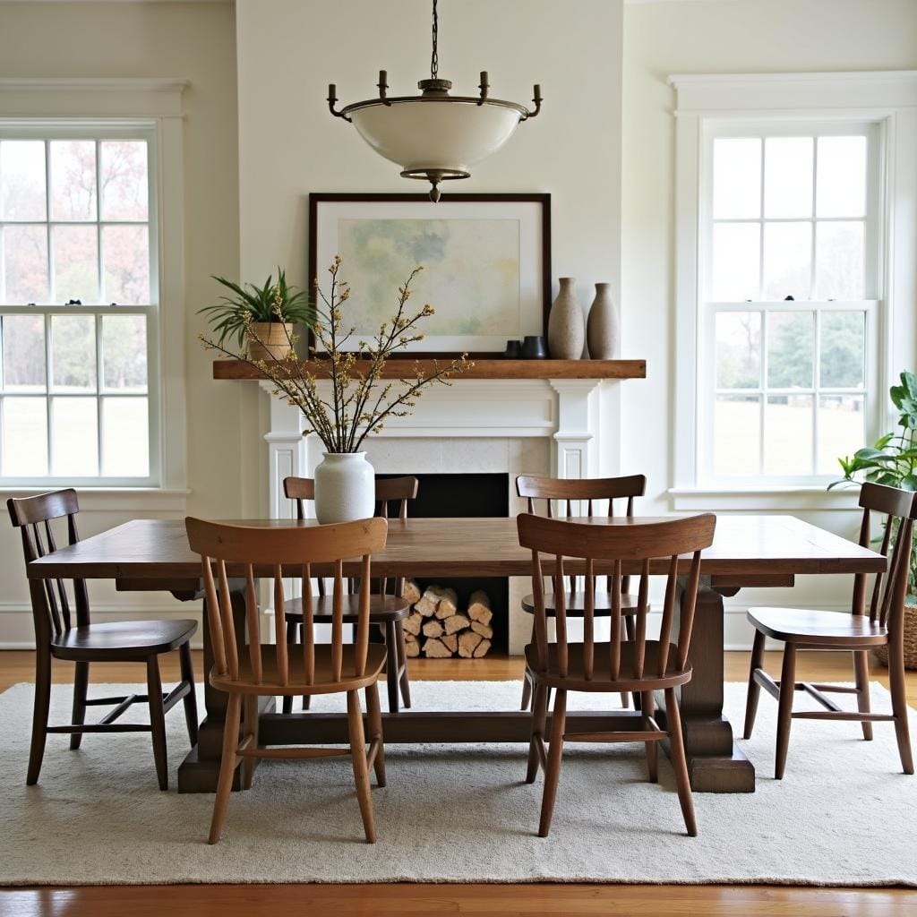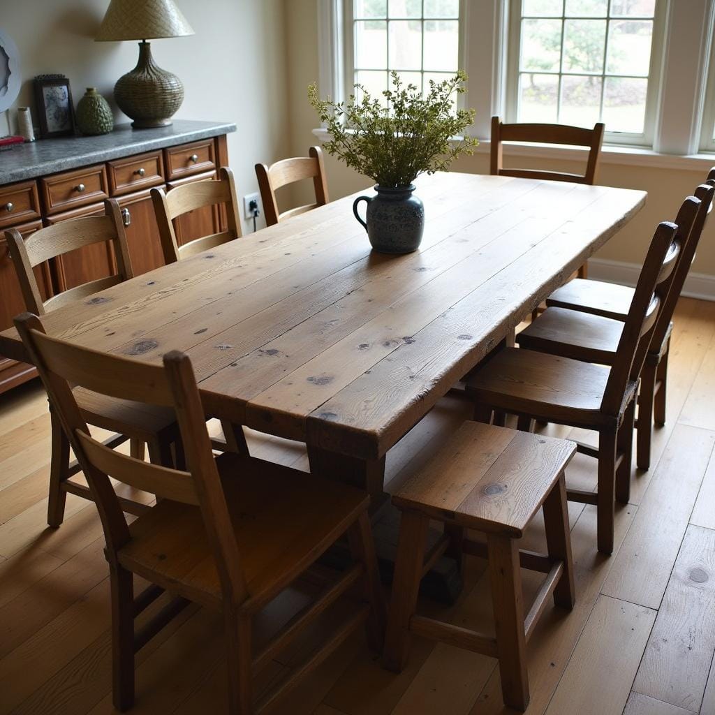 - Create contrast by pairing a rustic reclaimed wood piece with sleek, modern chairs or metal accents.