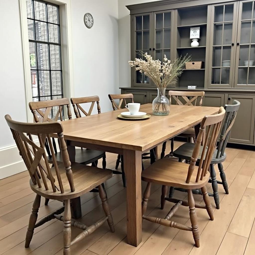 A large, wooden farmhouse dining table is perfect for family gatherings. Pair it with mismatched chairs for an extra touch of rustic charm.