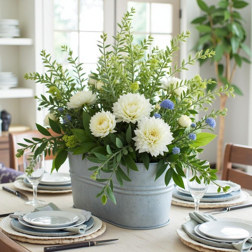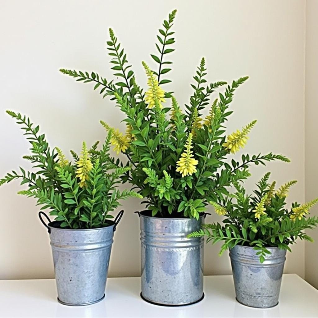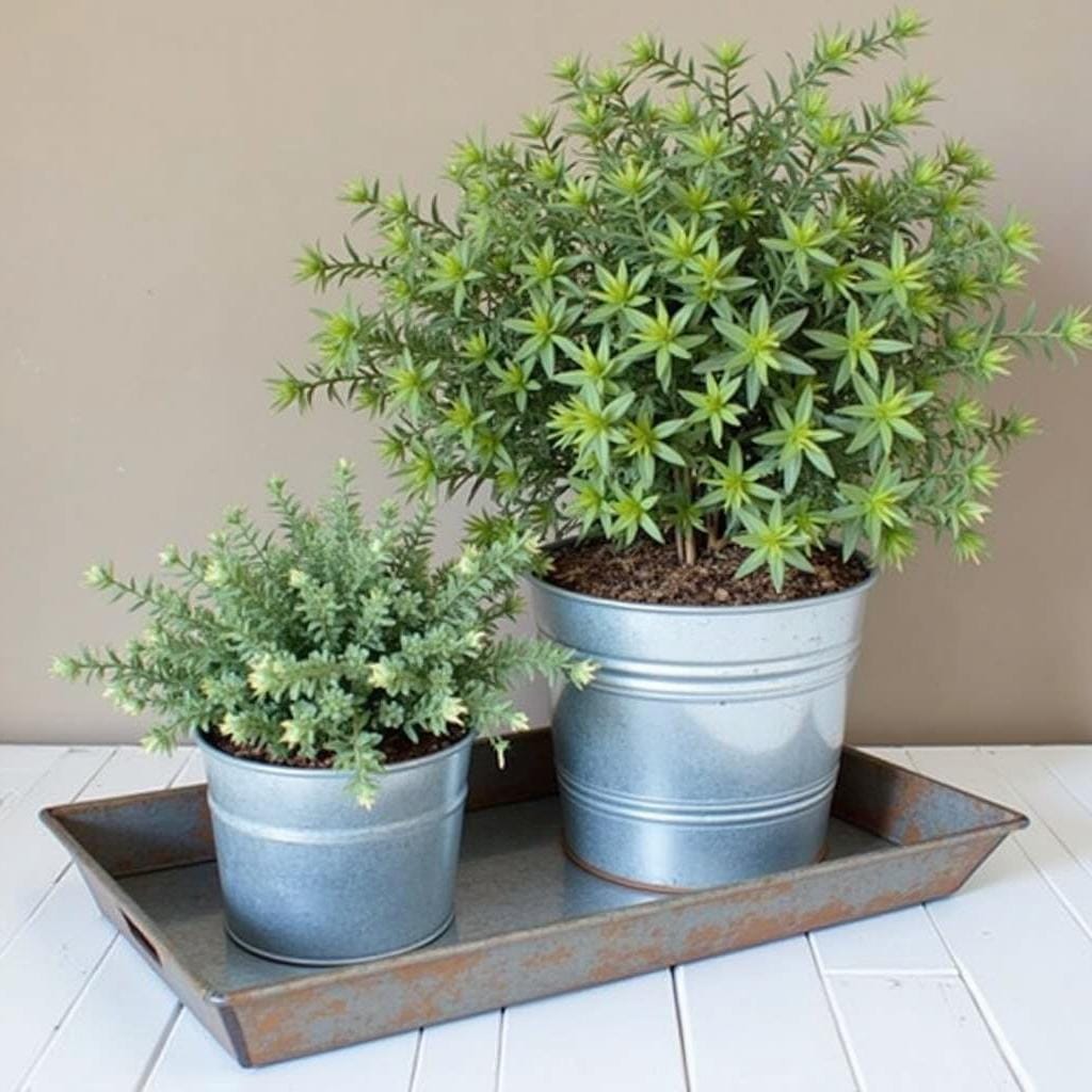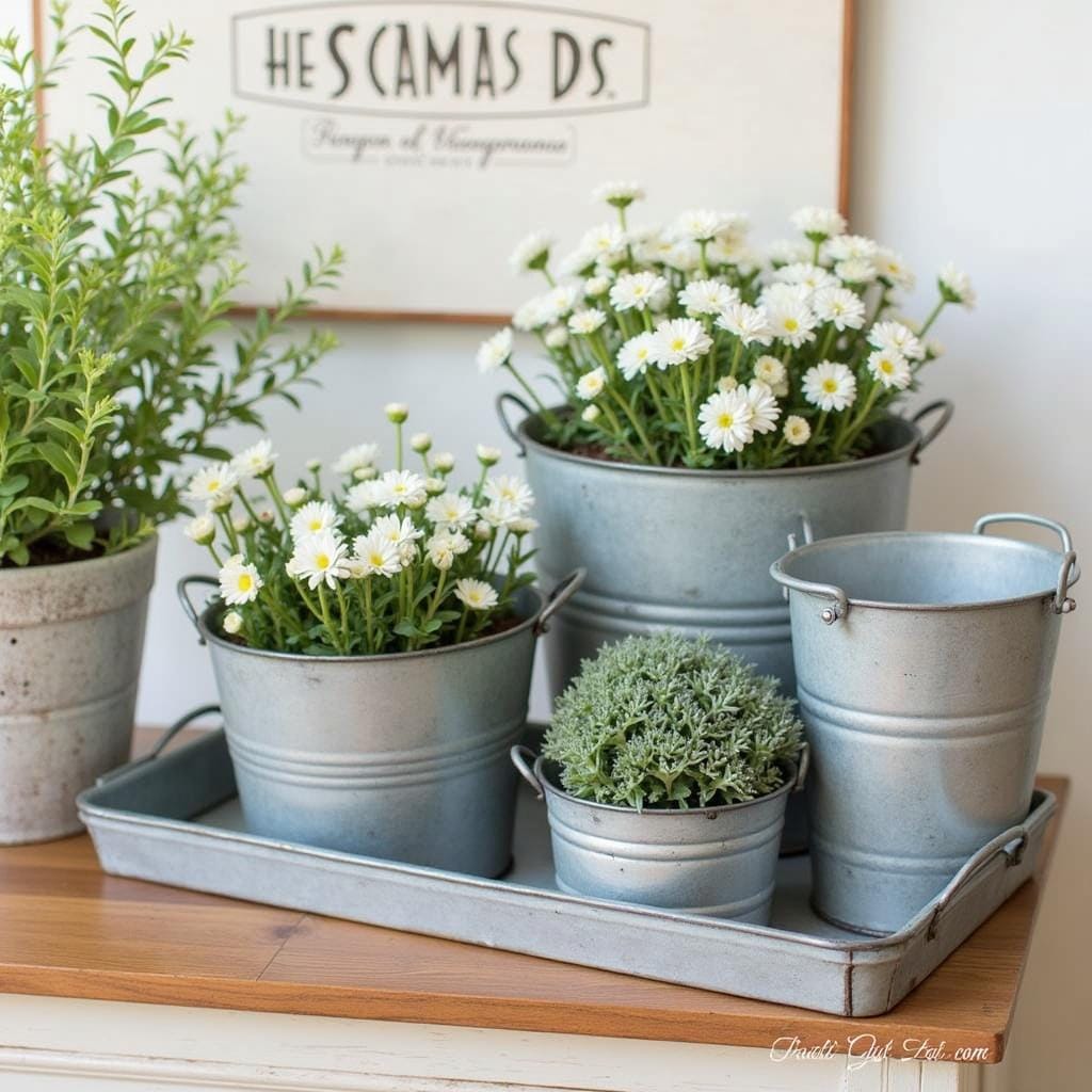 - A small galvanized bucket or pail makes a perfect, rustic container for a floral arrangement or a potted plant.