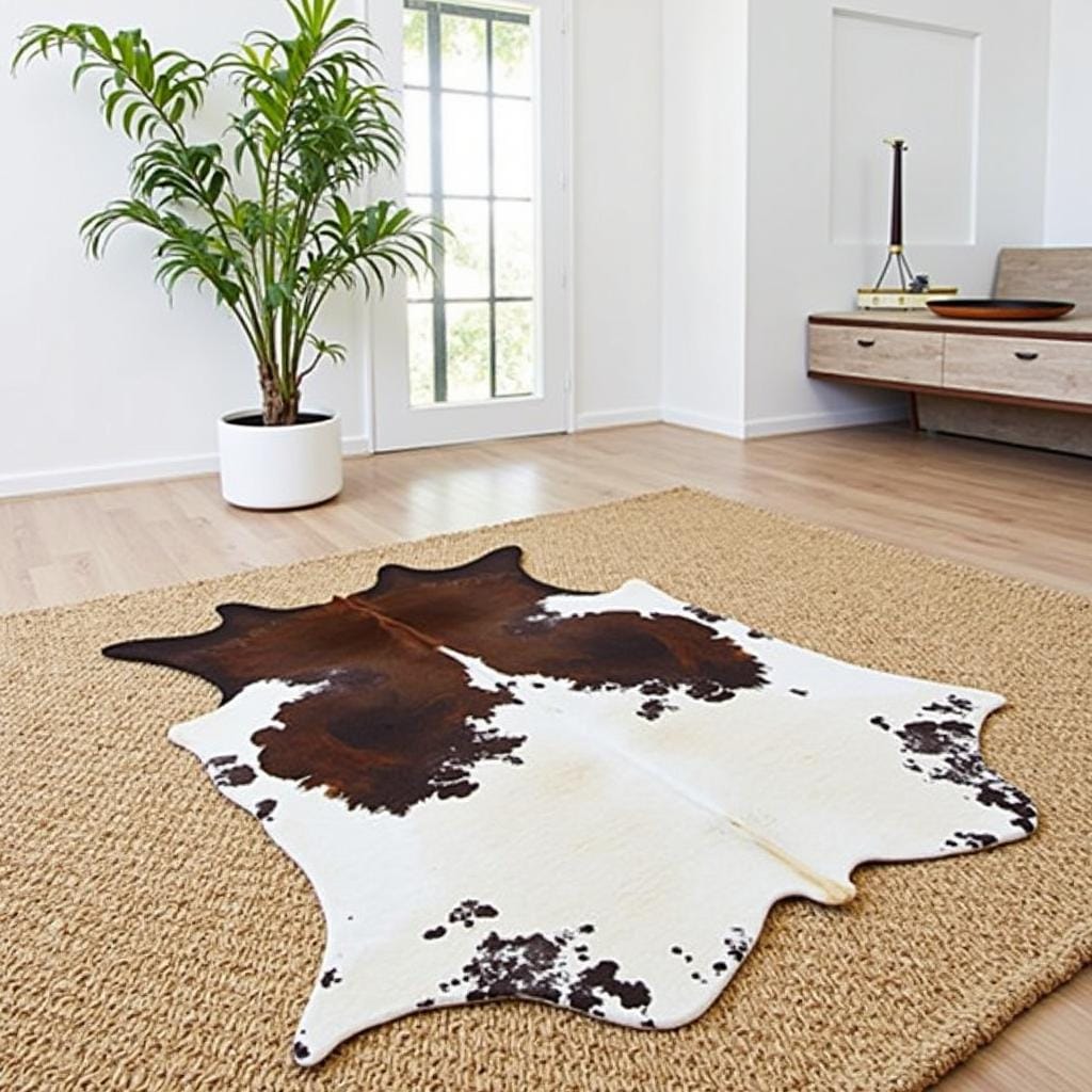 - For a more modern or rustic look, layer a faux cowhide rug (placed at an angle) over the base rug.
