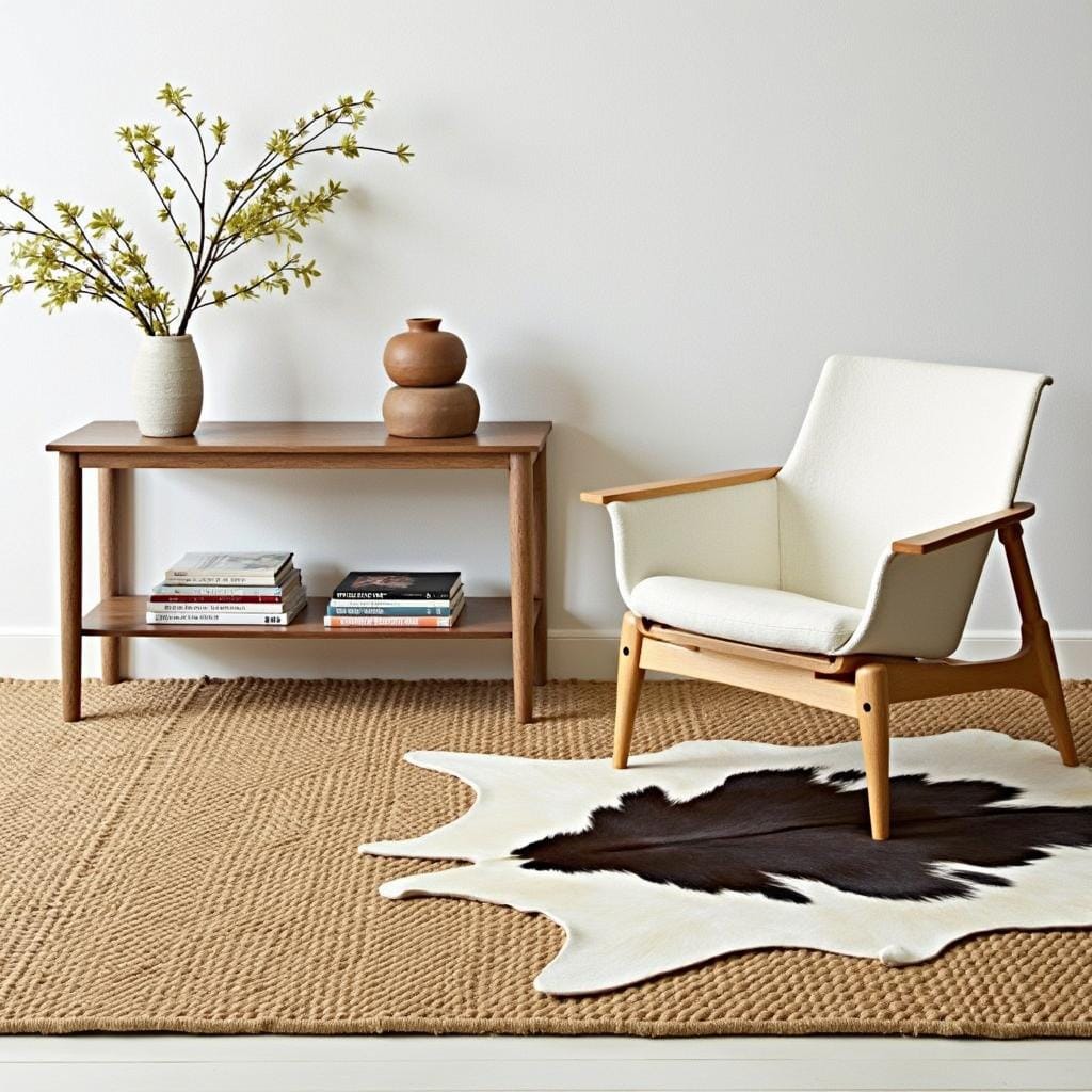 Layer rugs to add depth and texture. Use a jute or sisal rug as a base and top it with a smaller patterned or cowhide rug.