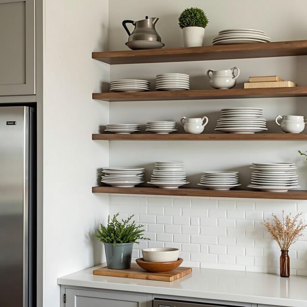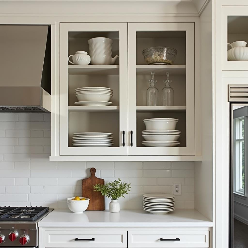 - Display everyday white dishware on open shelves or in a glass-front cabinet.