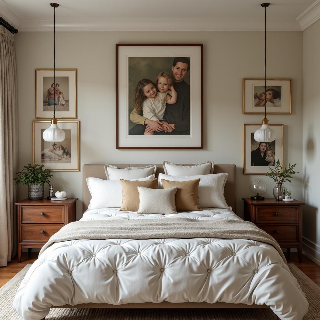 - A gallery wall of family photos in black and white creates a timeless, cohesive display.