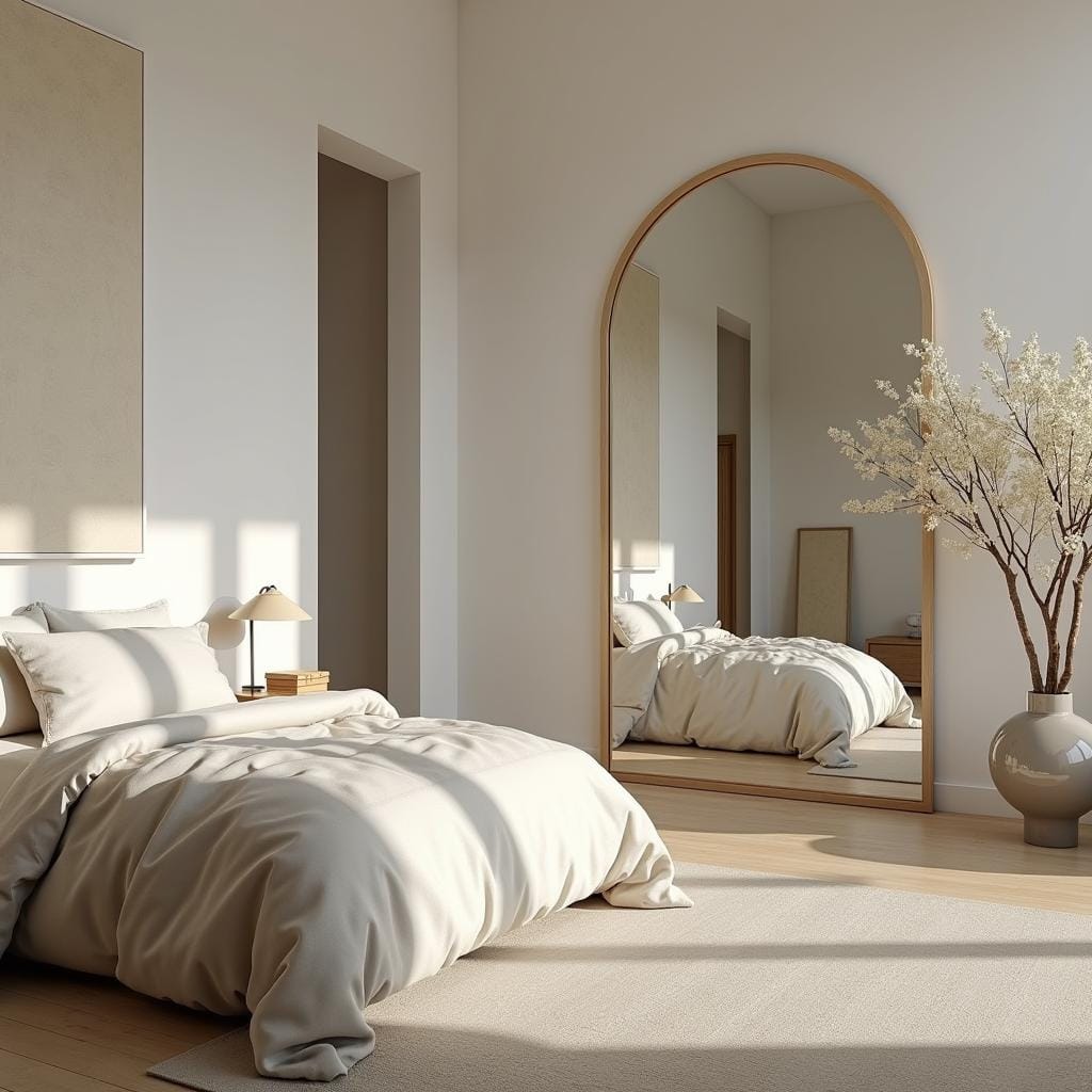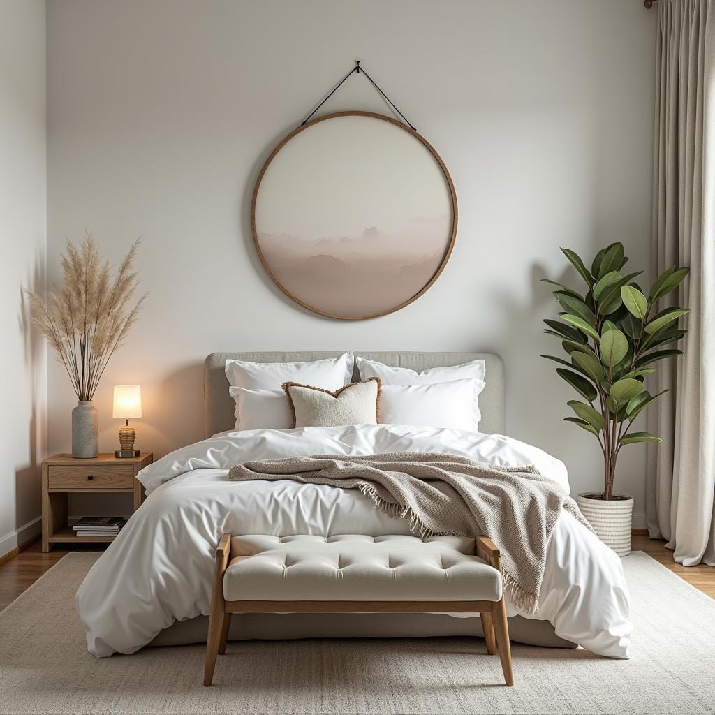 - Introduce warmth and interest through natural textures, like linen bedding, a wool rug, a wooden bench, or a stone vase.