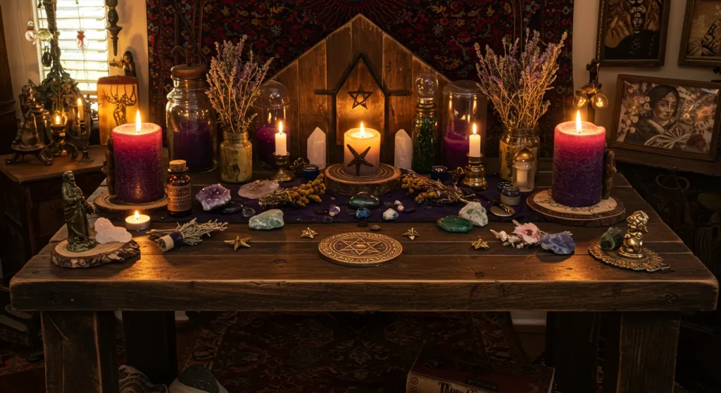 An altar table serves as the foundation for your sacred space. It can be as simple as a small shelf or as elaborate as a dedicated piece of furniture, providing a consecrated surface for your magical tools and offerings.
