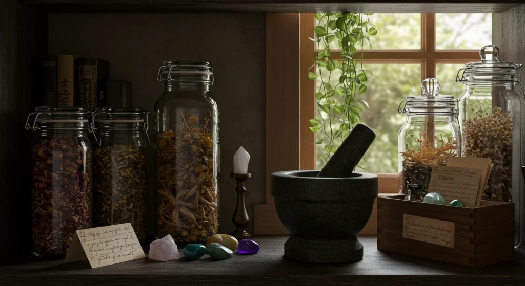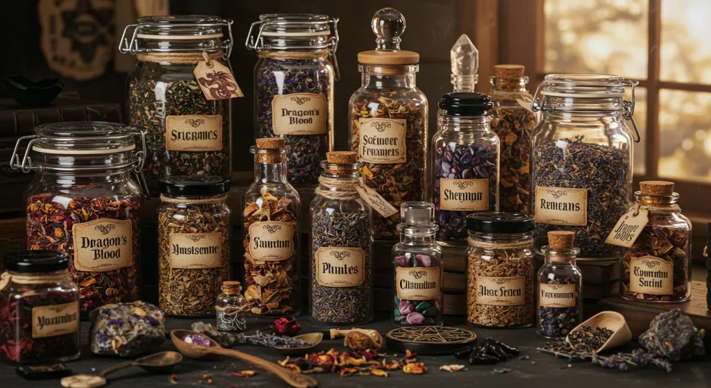 Dried herbs and flowers are essential for spellcraft, potions, and creating a magical atmosphere. They can be hung in bundles, displayed in jars, or burned as incense, each carrying its own unique properties and correspondences.
