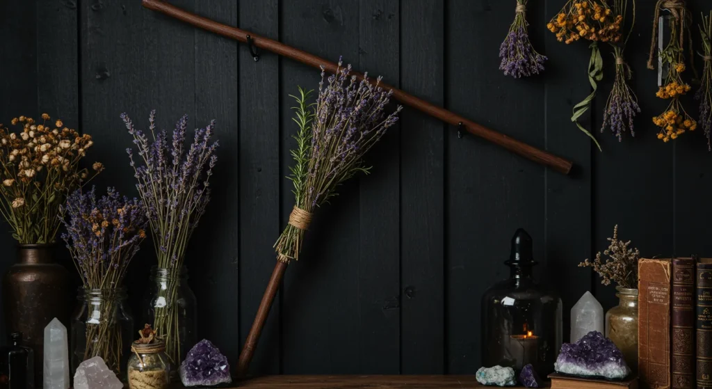 A besom, or witch’s broom, is a tool for ritual cleansing. It is used to sweep away negative energy and create a purified space for magic, without physically touching the floor.