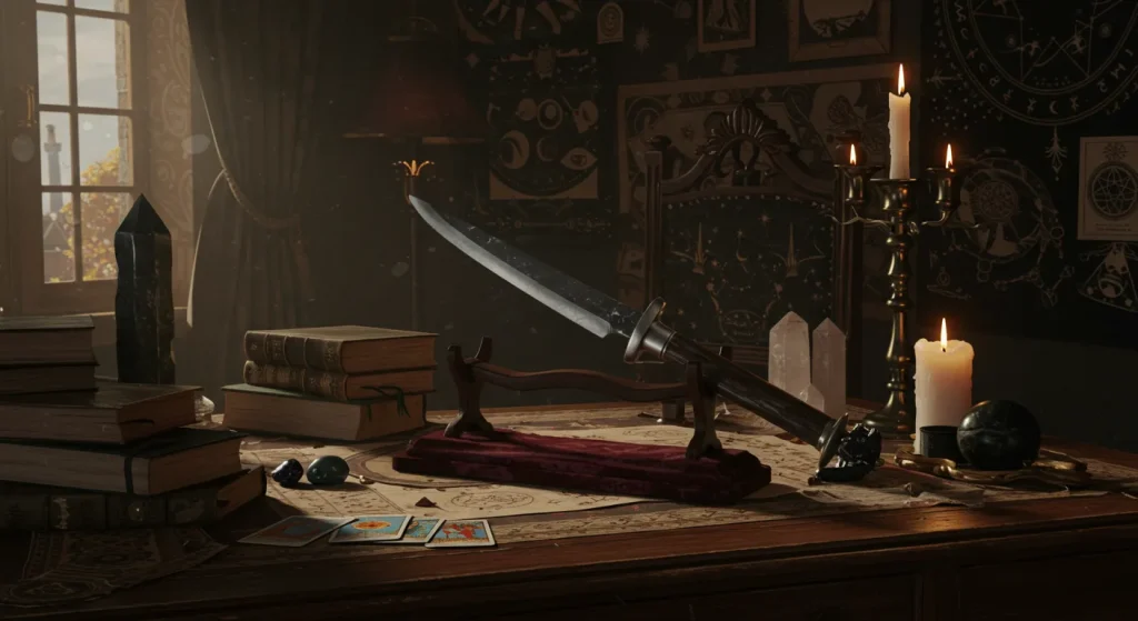 An athame is a ritual knife, typically double-edged with a black handle. It is not used for physical cutting but rather to direct energy, cast circles, and draw symbolic boundaries.