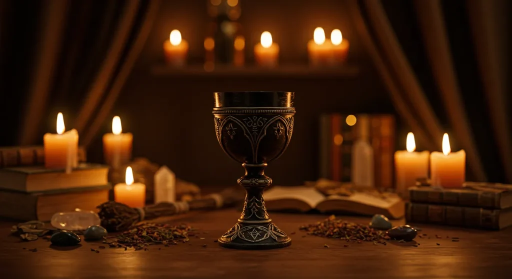 The chalice, or cup, represents the element of water and the divine feminine. It is used in rituals to hold wine, water, or other sacred liquids, symbolizing intuition, emotion, and receptivity.