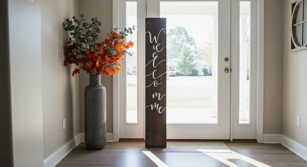 3. A Tall Welcome SignA vertical wooden sign leaned next to the door to add height, rustic charm, and a welcoming message.Low to Medium ($30 – $75)