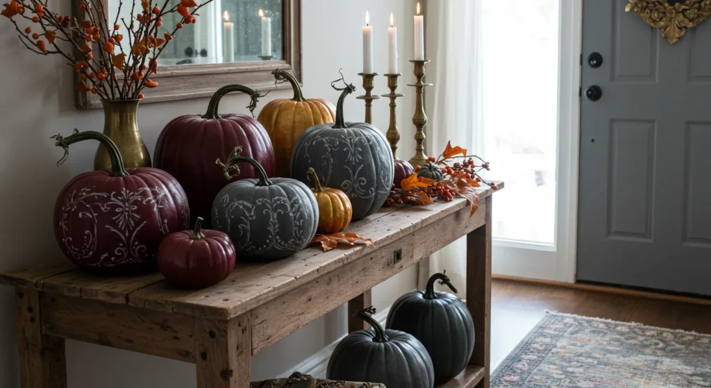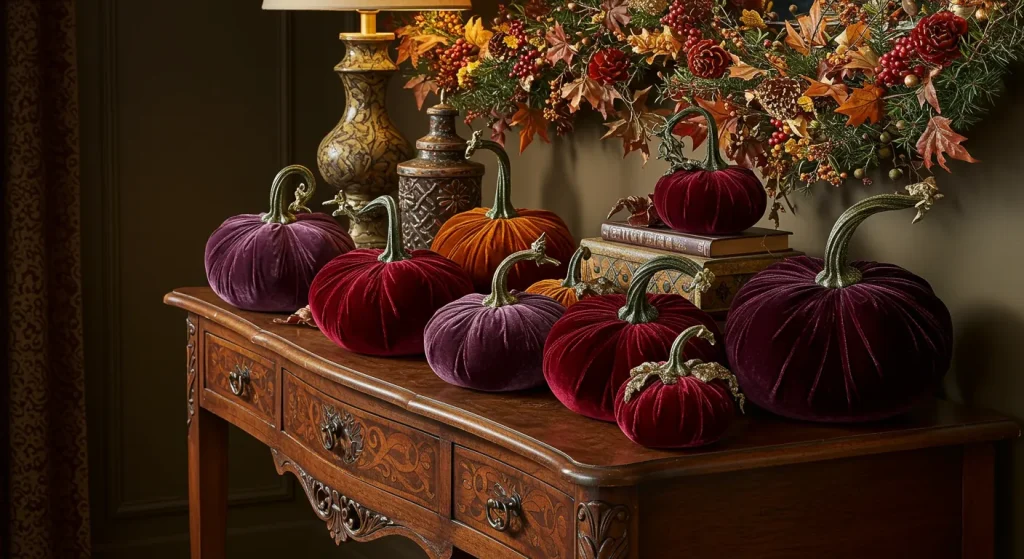 For a touch of unexpected softness and luxury, incorporate velvet pumpkins into your display. They are perfect for an indoor console table or a well-protected porch.