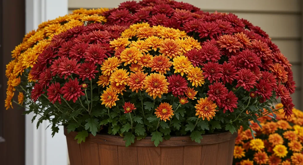 Style Tip: Instead of mixing colors in one pot, create a powerful statement by grouping several large planters together, each filled with a single, bold color of mum.