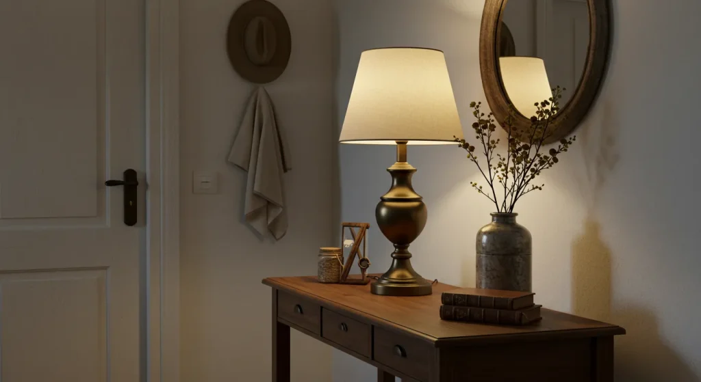 Inside your foyer, a stylish lamp on your console table is essential. It provides both a welcoming ambiance and practical light for finding keys or taking off shoes.