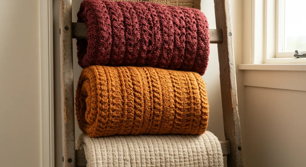 A small, rustic wooden ladder leaning against an entryway wall is a chic and practical way to store and display your collection of cozy fall blankets.
