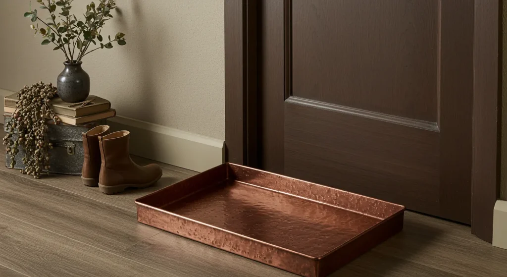Keep muddy boots and wet shoes off your clean floors with a stylish boot tray. A tray made of hammered copper is a beautiful and practical choice for fall.