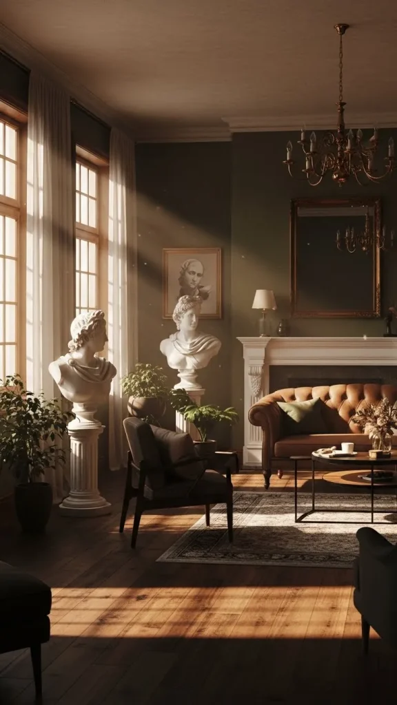 Classical bust statues bring a sense of history and museum-like quality to a vintage living room and its decor. These pieces, often made of plaster, marble, or bronze, represent the art and philosophy of ancient Greece and Rome. They add a sophisticated and intellectual element that elevates the surrounding decorative items.