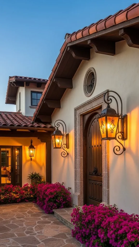 The designs of these lanterns can range from simple rustic boxes to elaborate colonial style lamps. Placing lanterns on either side of a grand door creates a symmetrical and welcoming entrance for the home. The play of light and shadow from the ironwork adds a layer of mystery and romance to the exterior.