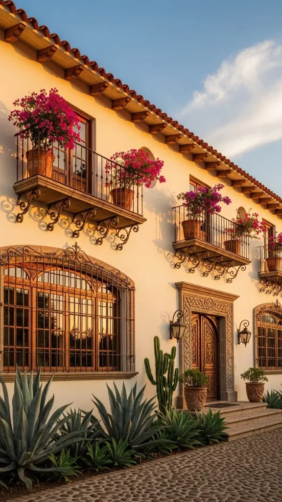 Balconies with iron railings are often found on the second story of larger hacienda style estates. These features allow residents to overlook the street or the courtyard while enjoying the outdoor breeze. The patterns in the ironwork can range from simple vertical bars to complex floral and scroll designs.