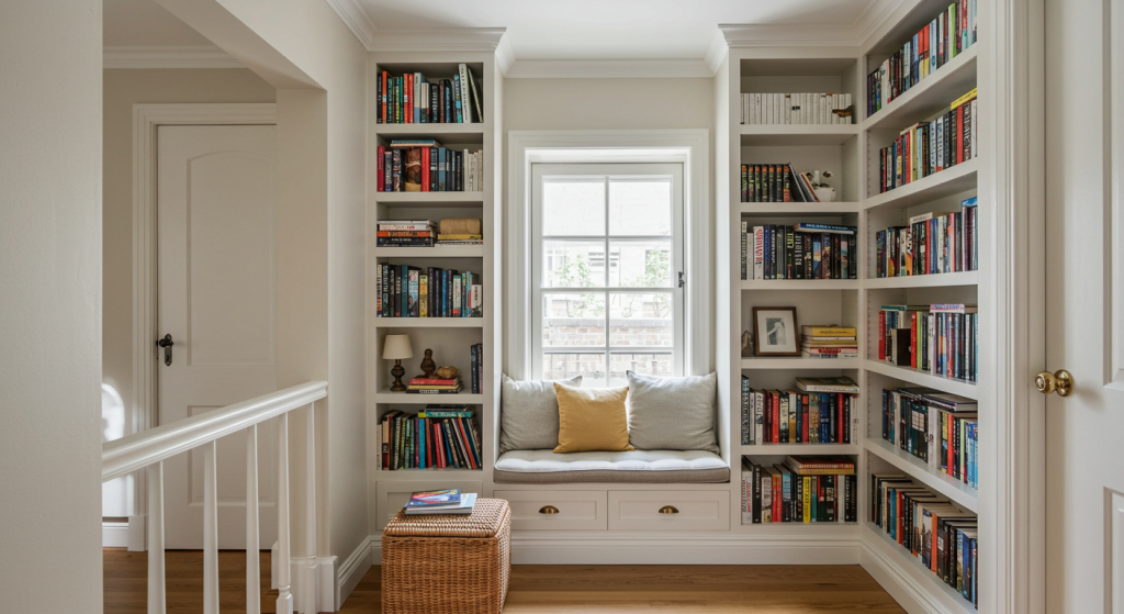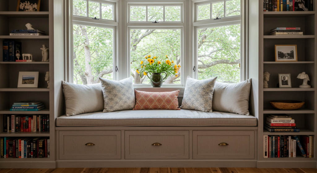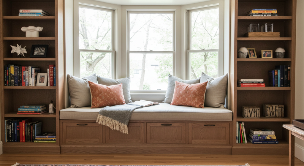 A window seat with built-in bookshelves underneath provides both seating and storage. This idea is perfect for bay windows or any area with a view. It creates a cozy space where you can relax with a good book.