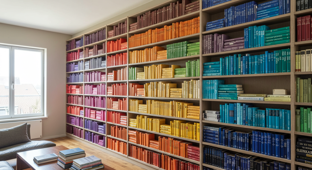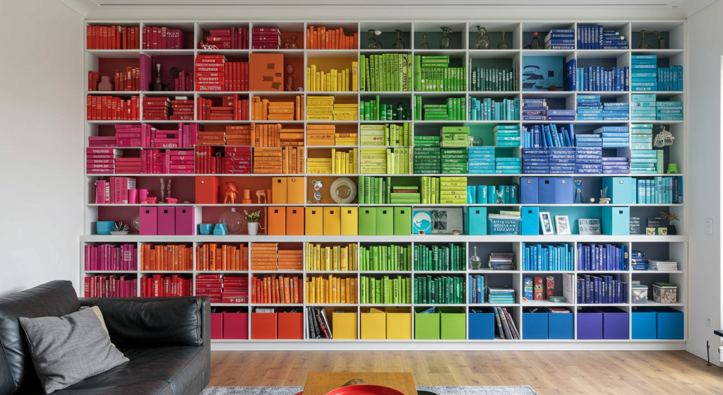 - Organizing books by color can turn the wall into a massive piece of abstract art, creating a huge visual impact.