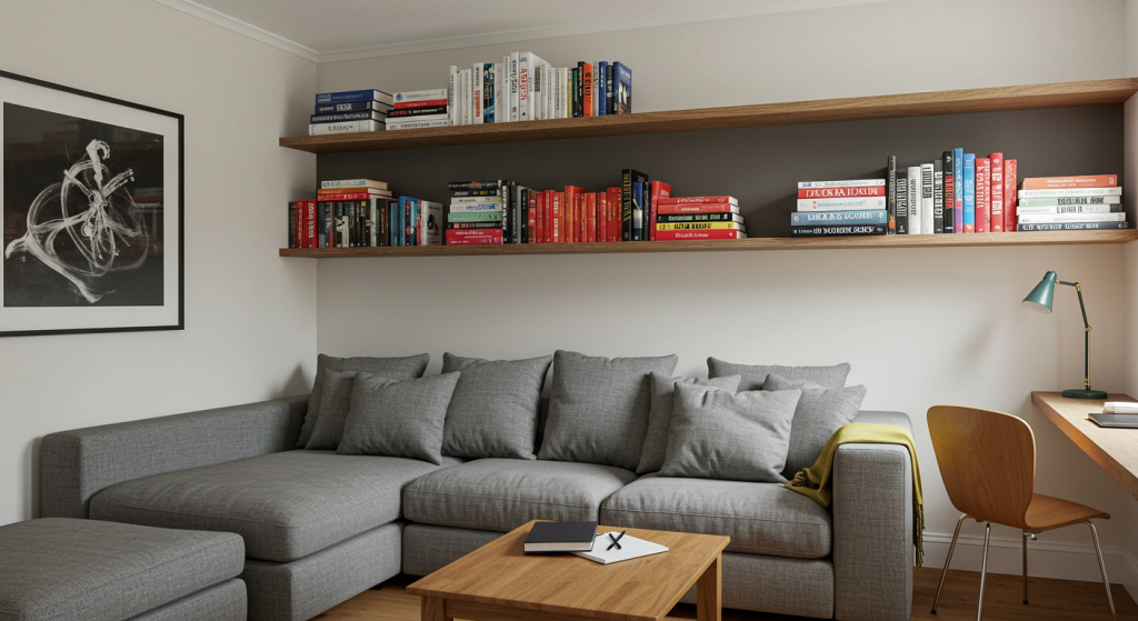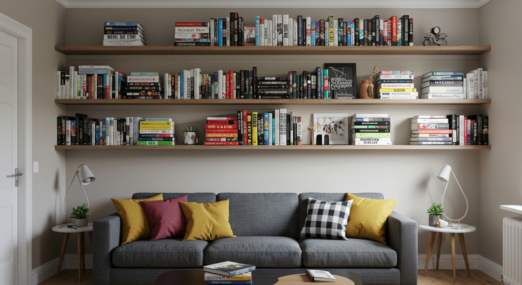 Maximize vertical space by installing shelves above sofas, beds, or desks. This approach keeps books within reach without taking up valuable floor space. It also adds character to the room while making it more functional.