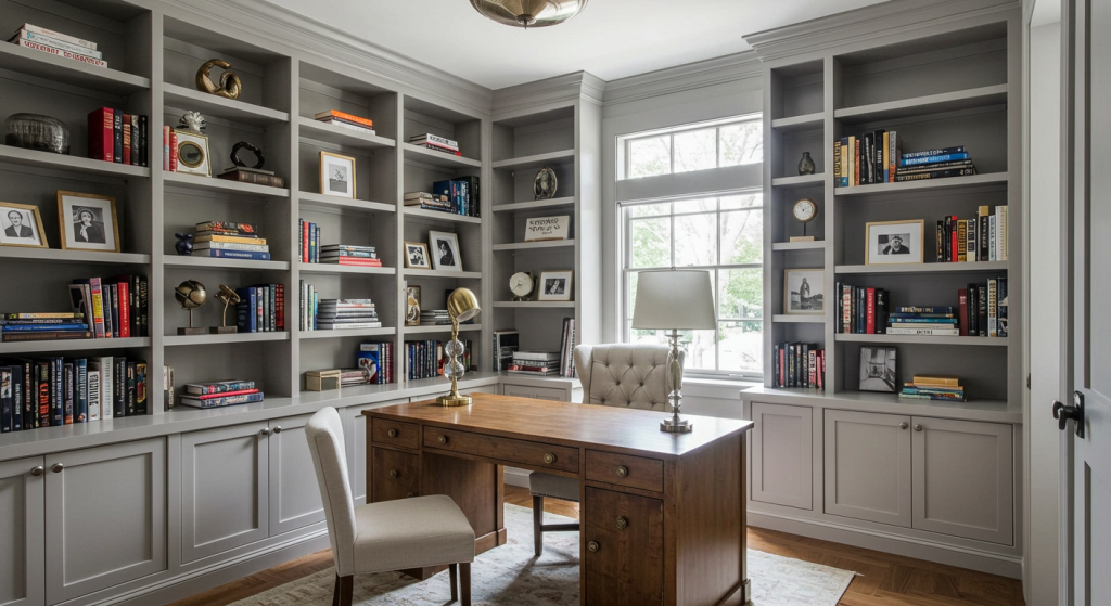 A home office and a library go hand in hand. Install bookshelves behind or beside your desk to create a sophisticated workspace. This setup keeps reference materials close and enhances the overall look of the office.