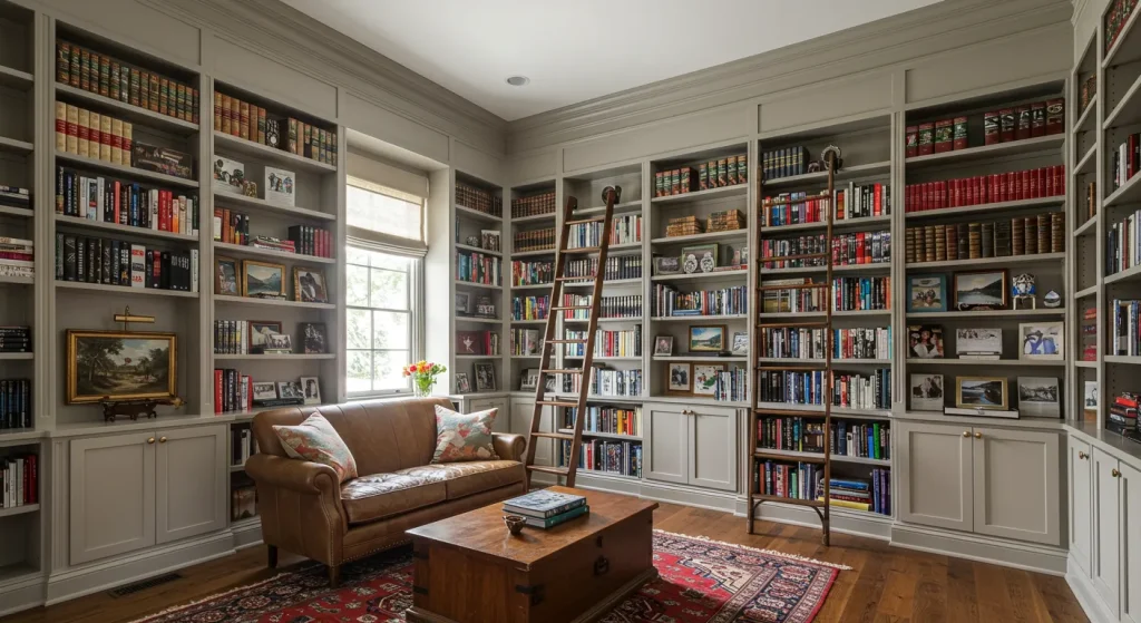 A rolling ladder not only makes it easier to reach high shelves but also adds a dramatic and sophisticated touch. This feature works well in both traditional and modern library designs.
