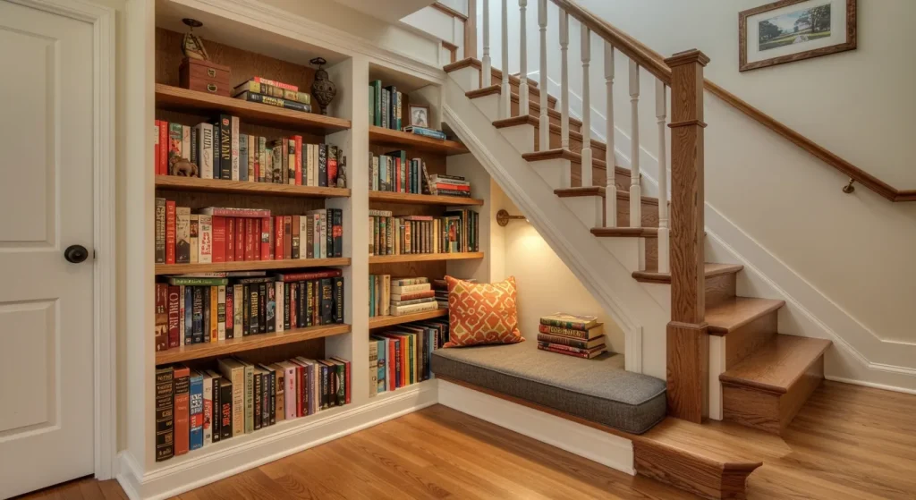 Utilize unused space under the stairs by installing bookshelves. This clever storage solution makes the most of every inch and creates a charming reading nook.