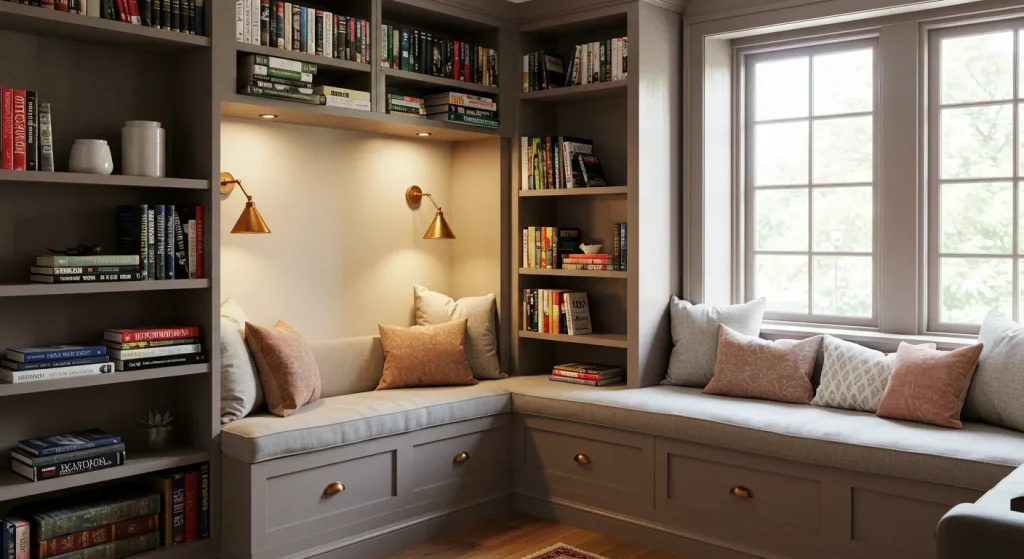 A small alcove or window seat with built-in bookshelves provides a perfect place to curl up with a good book. Add plush cushions and soft lighting for extra comfort.