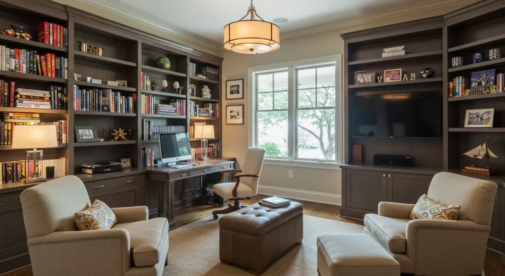 A home office with built-in bookshelves serves a dual purpose, providing both a workspace and a relaxing reading environment. Comfortable seating and good lighting are key elements in this design.