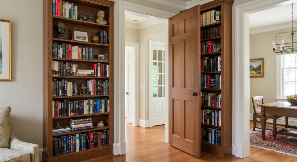 A secret door disguised as a bookshelf adds an element of mystery and intrigue. This design is perfect for those who love the idea of a hidden retreat.