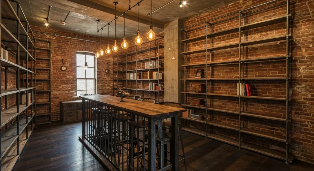 Combine metal and wood elements to create an industrial aesthetic. Exposed brick walls, steel-framed shelves, and vintage lighting fixtures add character and a modern edge.