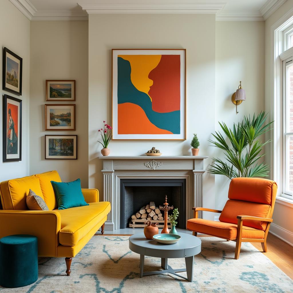 Introduce pops of bold, optimistic color, such as mustard yellow, avocado green, teal, or burnt orange, to brighten up the space. Use these vibrant hues in moderation on an accent wall, a statement armchair, or through decorative accessories like cushions and vases.