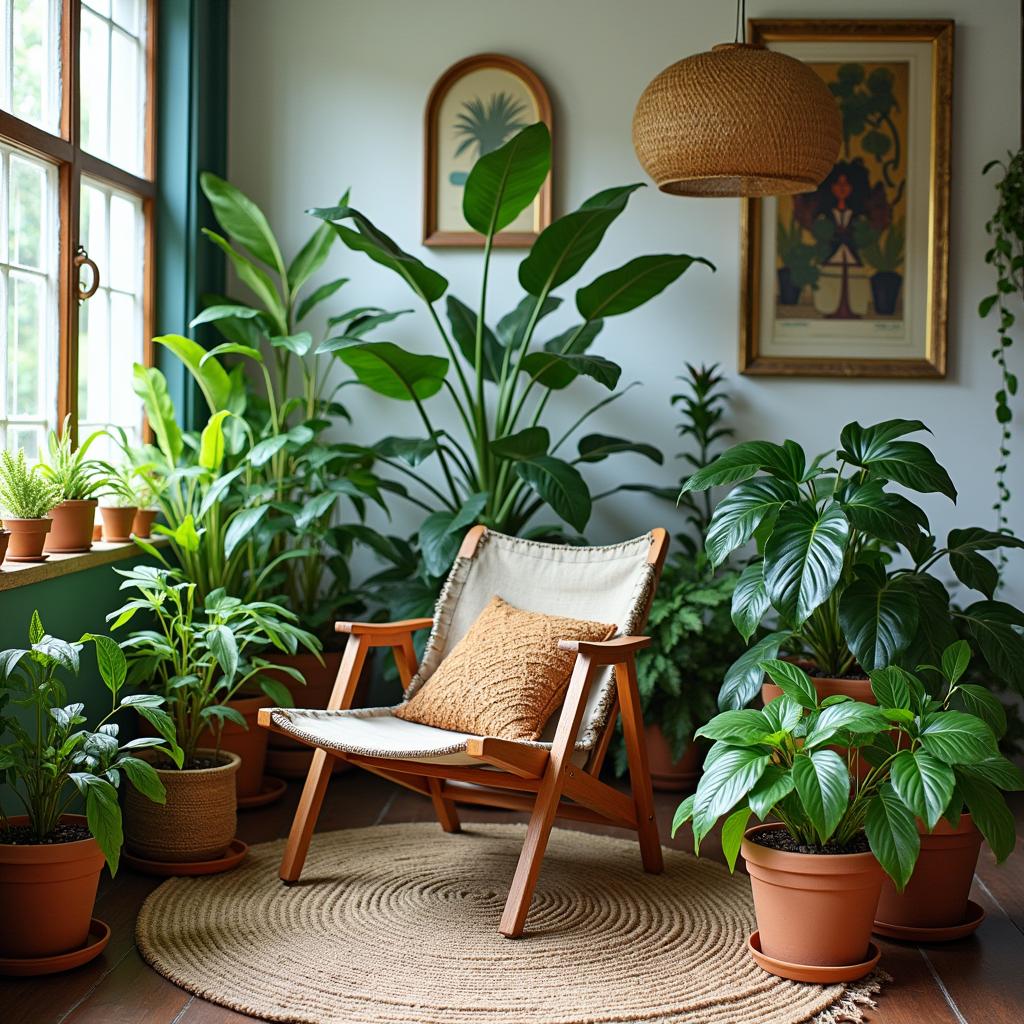 Create your own indoor jungle by mixing large floor plants like a Monstera, hanging plants like a Pothos, and smaller succulents on shelves, using an array of terracotta pots and woven basket planters to enhance the earthy vibe.