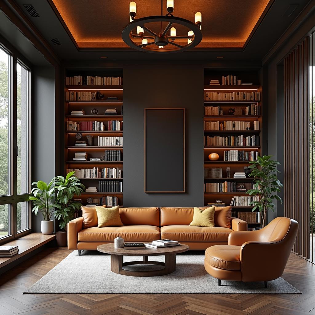 For a traditional and cozy atmosphere, opt for vintage leather chairs paired with wood bookshelves. The warmth of leather and wood adds a classic touch to your home library.