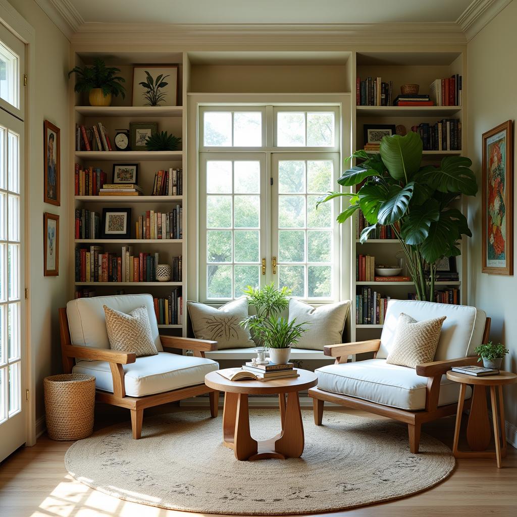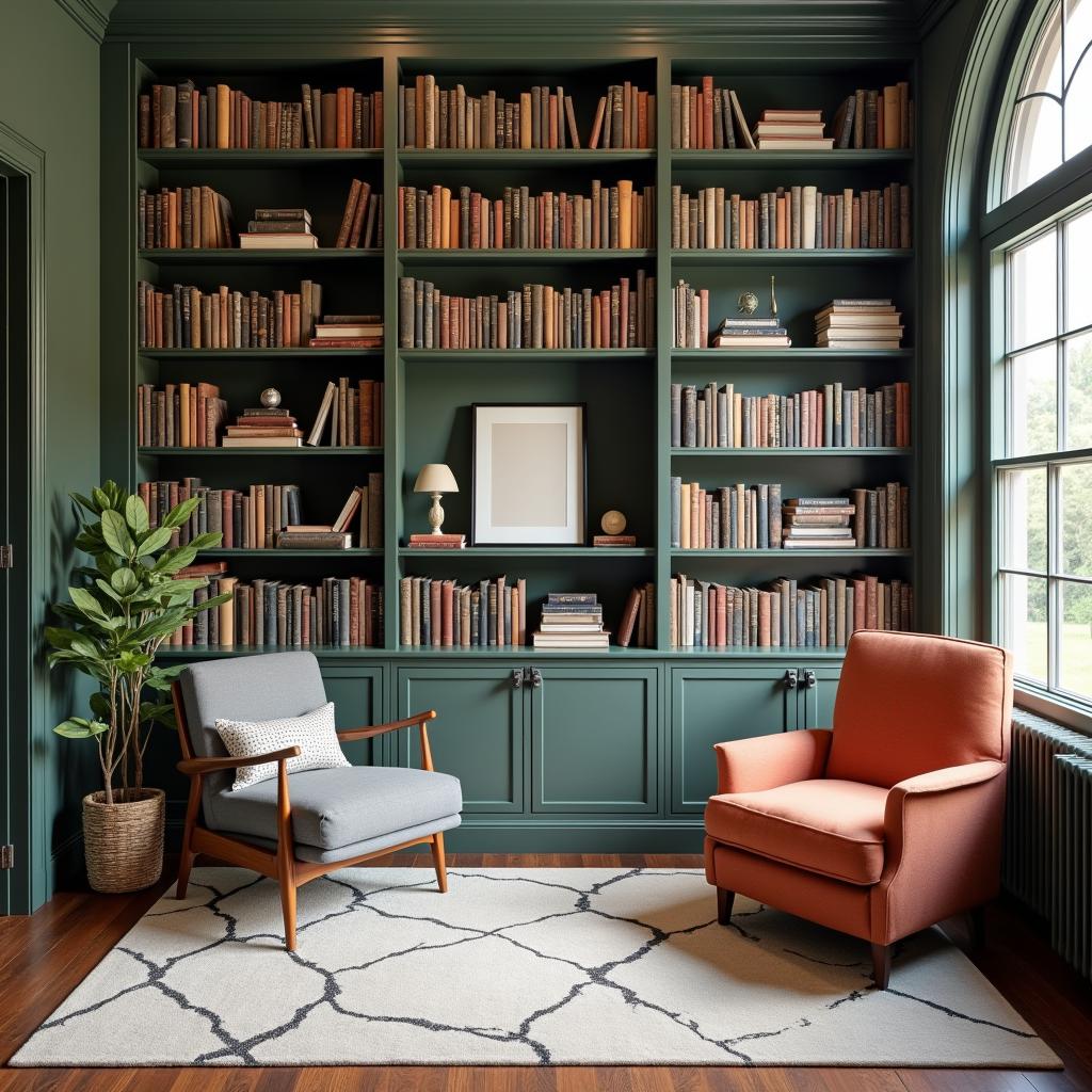 For a relaxing, nature-inspired library, go tropical! Use vibrant greens, natural wood finishes, and lush plants to create a soothing environment for your book collection.
