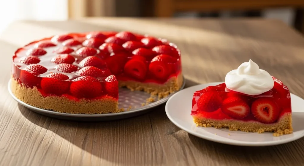 A beautiful layered dessert featuring a pecan-shortbread crust, a sweet cream cheese layer, a strawberry Jell-O and fresh fruit layer, and a final topping of whipped cream.